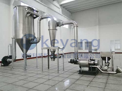 物料由加料系統均勻的送入粉碎室受到高速旋轉的粉碎盤的強烈沖擊,同時受到離心力的作用,與粉碎齒圈發生碰撞,受到剪切、摩擦、碰撞等多種綜合力的作用,使物料粉碎,被粉碎的物料隨氣流運動到分級區,通過變頻調節的分級輪,對粗細物料進行分離,符合細度要求的產品隨氣流進入旋風收集器和除塵器收集,粗物料返回分級區二次粉碎。